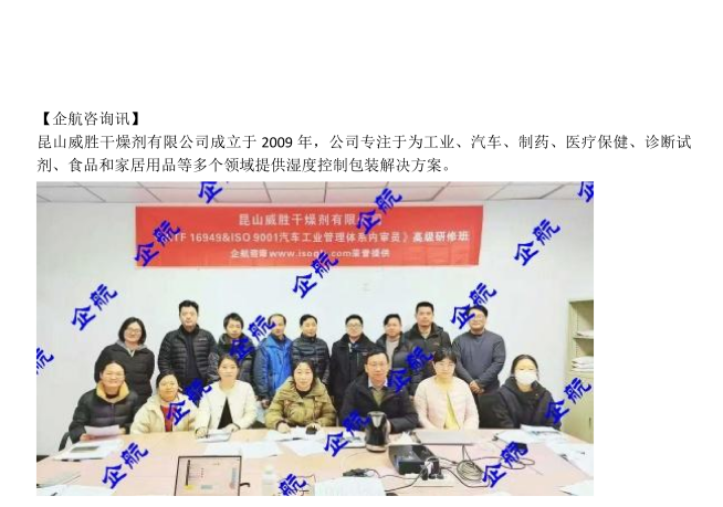 企航咨詢與昆山威勝干燥劑有限公司合作IATF16949@ISO9001汽車管理體系內審員高級研修班
